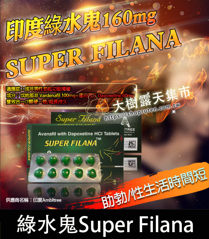 Super Filana 綠水鬼,是 Ambitree 藥廠推出的最新一代壯陽雙效產品。它結合了 Avanafil(阿伐那非)和 Dapoxetine(必利勁),這兩種成分具有助勃和延時的雙重作用,特別適合勃起困難和早洩的男性使用。Super Filana 綠水鬼不僅效果快速,吸收迅速,而且副作用極低。這款產品自上市以來,已迅速成為市場上最受歡迎的雙效壯陽產品之一,其效果穩定且性價比極高。